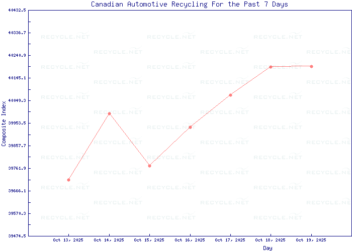 The Canadian Automotive Recycling Composite Index tracks the changing market prices of automotive related scrap in Canada. The Index consists of a weighted basket of specific benchmark grades of automotive scrap. The benchmarks include specific grades of scrap aluminum, brass, lead, steel, zinc, batteries and catalytic converters. The Index includes snapshots of 5 viewpoints of market trends : the past 7 days, past 30 days, past 90 days, past 1 year and past 2 years.