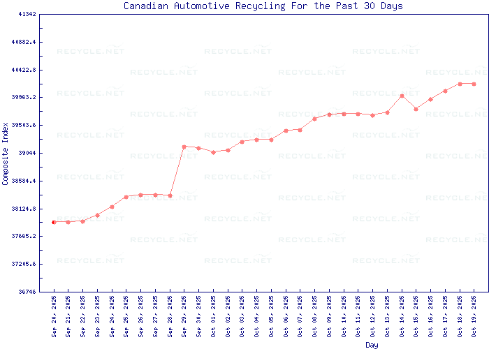 The Canadian Automotive Recycling Composite Index tracks the changing market prices of automotive related scrap in Canada. The Index consists of a weighted basket of specific benchmark grades of automotive scrap. The benchmarks include specific grades of scrap aluminum, brass, lead, steel, zinc, batteries and catalytic converters. The Index includes snapshots of 5 viewpoints of market trends : the past 7 days, past 30 days, past 90 days, past 1 year and past 2 years.