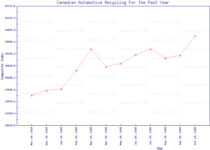 The Canadian Automotive Recycling Composite Index tracks the changing market prices of automotive related scrap in Canada. The Index consists of a weighted basket of specific benchmark grades of automotive scrap. The benchmarks include specific grades of scrap aluminum, brass, lead, steel, zinc, batteries and catalytic converters. The Index includes snapshots of 5 viewpoints of market trends : the past 7 days, past 30 days, past 90 days, past 1 year and past 2 years.